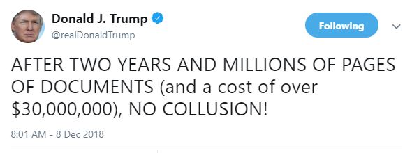 - Claimed that the prosecutorial sentencing reports for Paul Manafort, his former campaign chairman, and Michael Cohen, his longtime fixer, “cleared” Trump of any possible “collusion” charges. Actually, those court filings identified Trump as directing the scheme to pay hush-money settlements to two women for their silence about sex, in violation of campaign finance laws. The filings also opened new and earlier avenues for Special Counsel Robert S. Mueller III to pursue about contacts by Russians with Trump’s campaign. “Prosecutors investigating President Trump and his team draw a portrait of a candidate who personally directed an illegal scheme to manipulate the 2016 election and whose advisers had more contact with Russia than Trump has ever acknowledged,” said The New York Times, and up to 14 Russian contacts per The Washington Post.