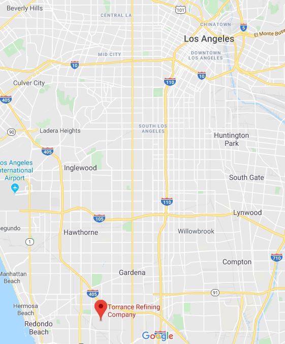The ExxonMobile Torrance Refinery is 14 miles from Downtown Los Angeles (Google maps)