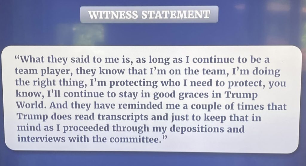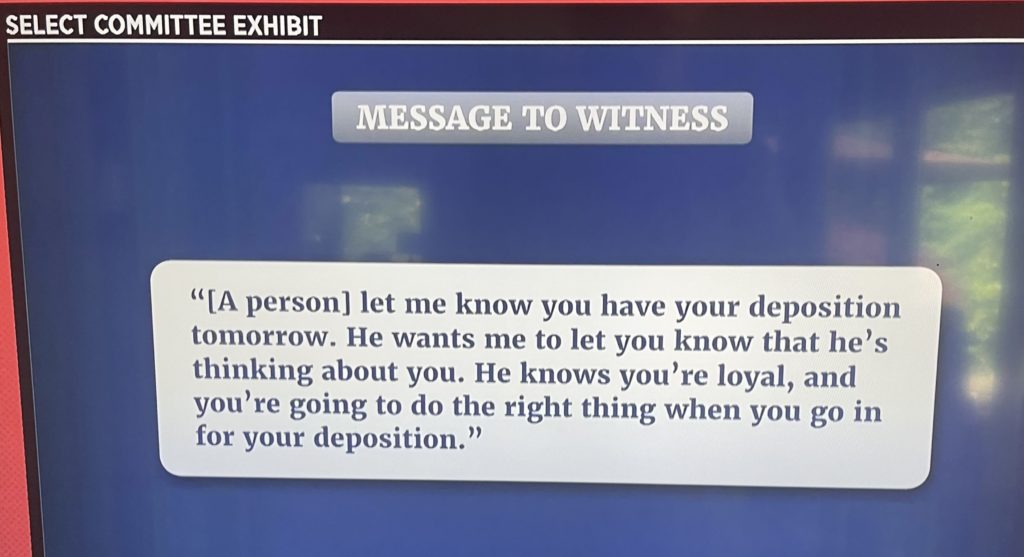 The first message: the game is up because the J6 committee has the goods on Trump’s conspiracy, the coverup and the witness tampering so it’s time to either rat out Donald to save your own skin or give up any hope of leniency when indictments are handed out.